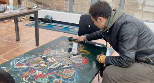 图为年轻一代唐卡艺人正在制作唐卡漆画。