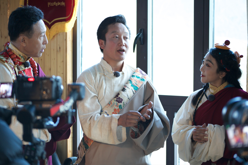 图为嘎玛斯加为央视乘着大巴看中国西藏行的嘉宾介绍唐卡历史。